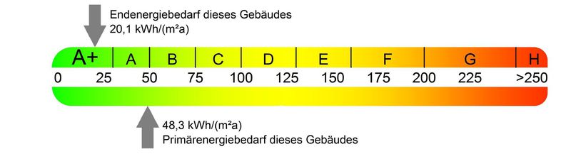 - Energiebedarf des Gebäudes 20,1Kwh/(m²a) siehe Energieausweis