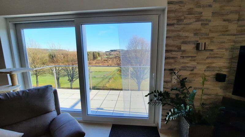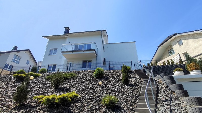 Dieses geräumige Haus bietet im Erdgeschoss eine großzügige Küche mit viel Platz zum Kochen und Essen sowie einen breiten Flur, der zu einem komfortablen Badezimmer und einem gemütlichen Wohn- und Essbereich führt. Am Wohnzimmer ist ein Balkon mit Schiebeanlage und Sicht in die unverbaubare Landschaft. Oberhalb vom Esszimmer befindet sich ein weiterer Balkon. Die Balkone haben Edelstahlgeländer mit Sicherheitsglas. Von der Küche ebenso wie vom Esszimmer gelangt man auf die überdachte Terrasse, welche eine idyllische Aussicht auf die Umgebung bietet und zum Grillen einlädt.